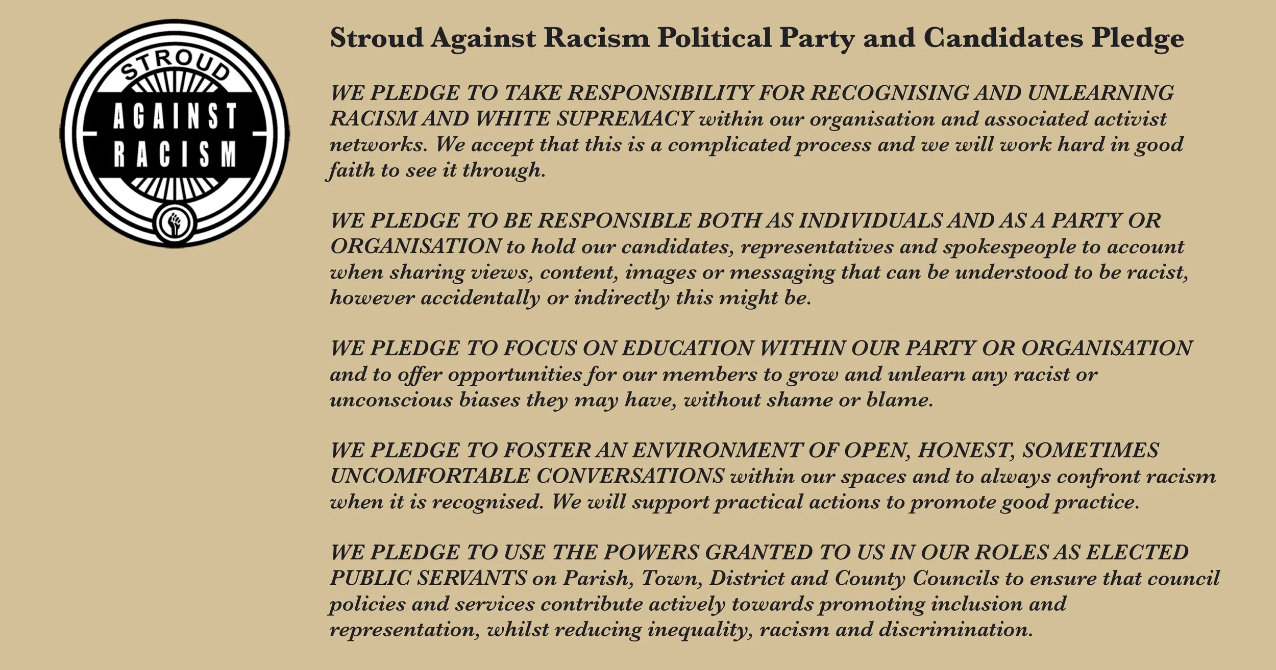All we ask of those that sign it is that they make a commitment to going on that journey of unlearning and learning, of confronting racism wherever they encounter it and of being standard-bearers for inclusion, advocacy and positive change for all communities in our local government.
